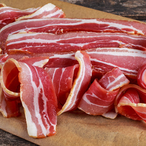 Our bacon comes from our free range herd of Tamworth and Gloucestershire Old Spots pigs. We cure the bacon by dry curing, which involves rubbing curing salt and sugar into the pork and allowing it to permeate by osmosis for three to four weeks. The cured bacon is then air dried, then sliced. We also smoke the bacon over oak chips to produce proper lightly smoked bacon.